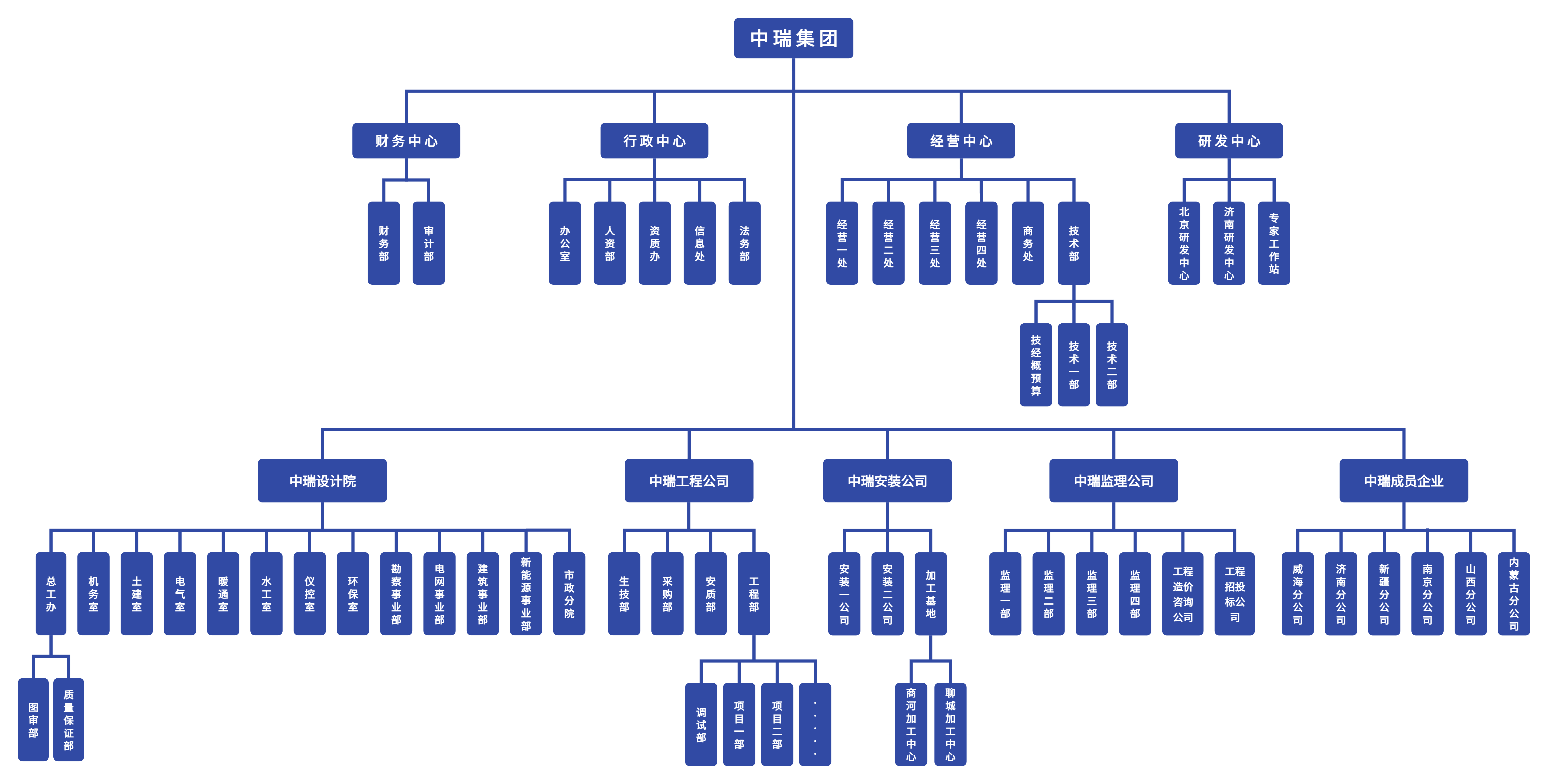 中瑞组织架构建设以集团部室为服务单位,以设计院、工程公司、安装公司、监理公司四大子分公司为核心支柱,充分整合各子分公司在五大板块和八大领域的专业优势和资源,同时,多个事业部和分公司作为平台的延伸触角,紧紧围绕市场需求和行业趋势,灵活开展各类专项业务和区域业务,深入挖掘市场潜力,拓展业务边界。